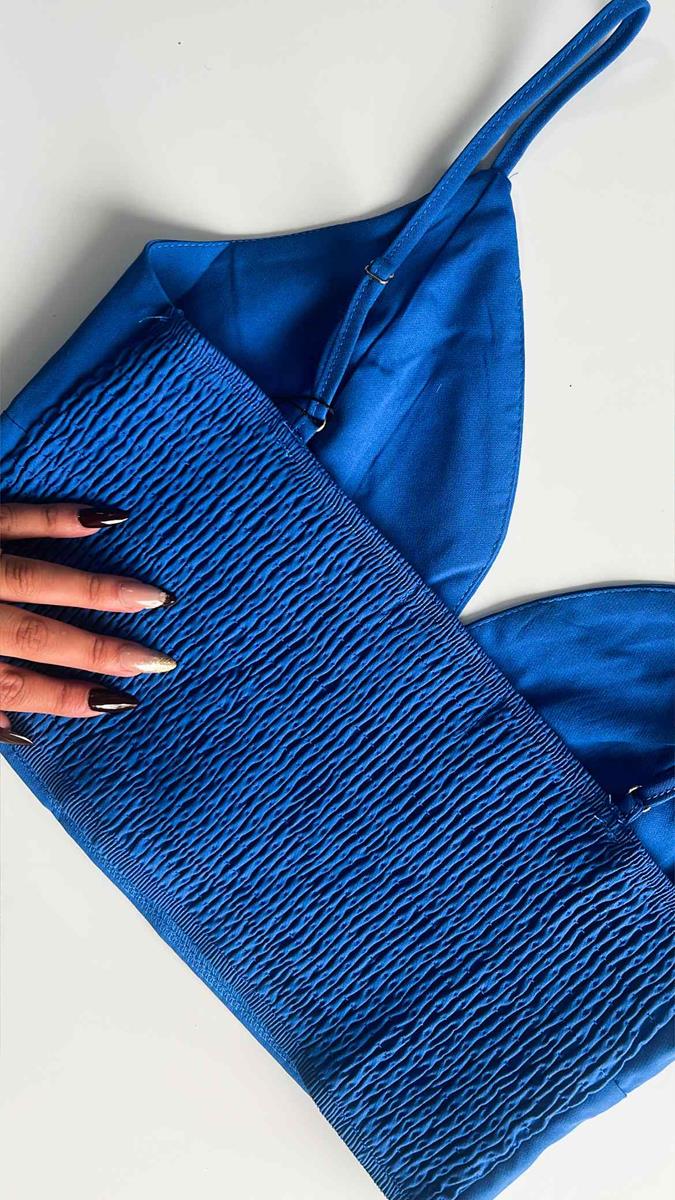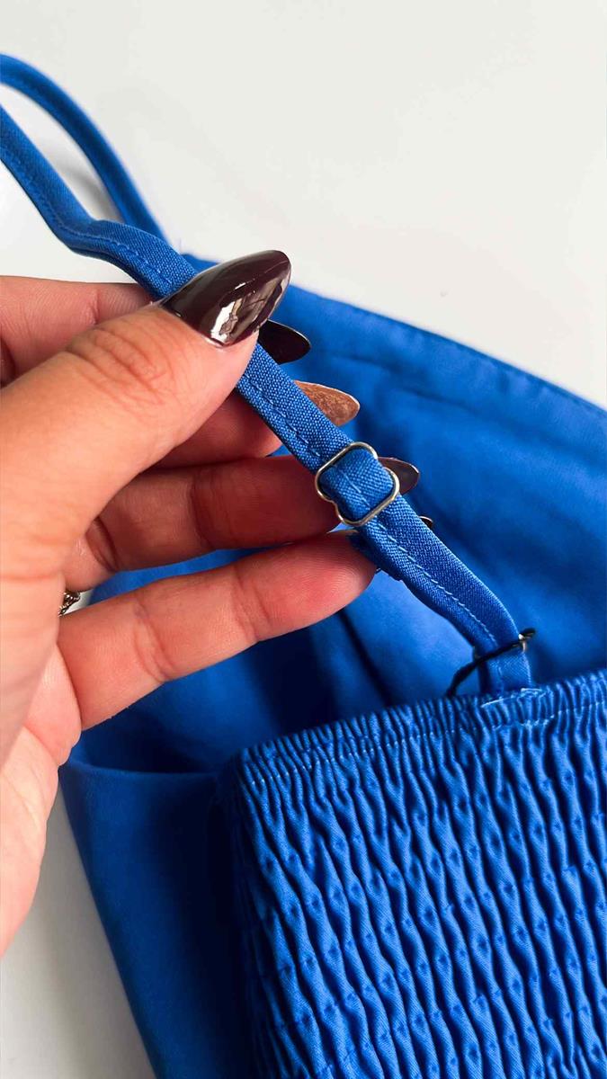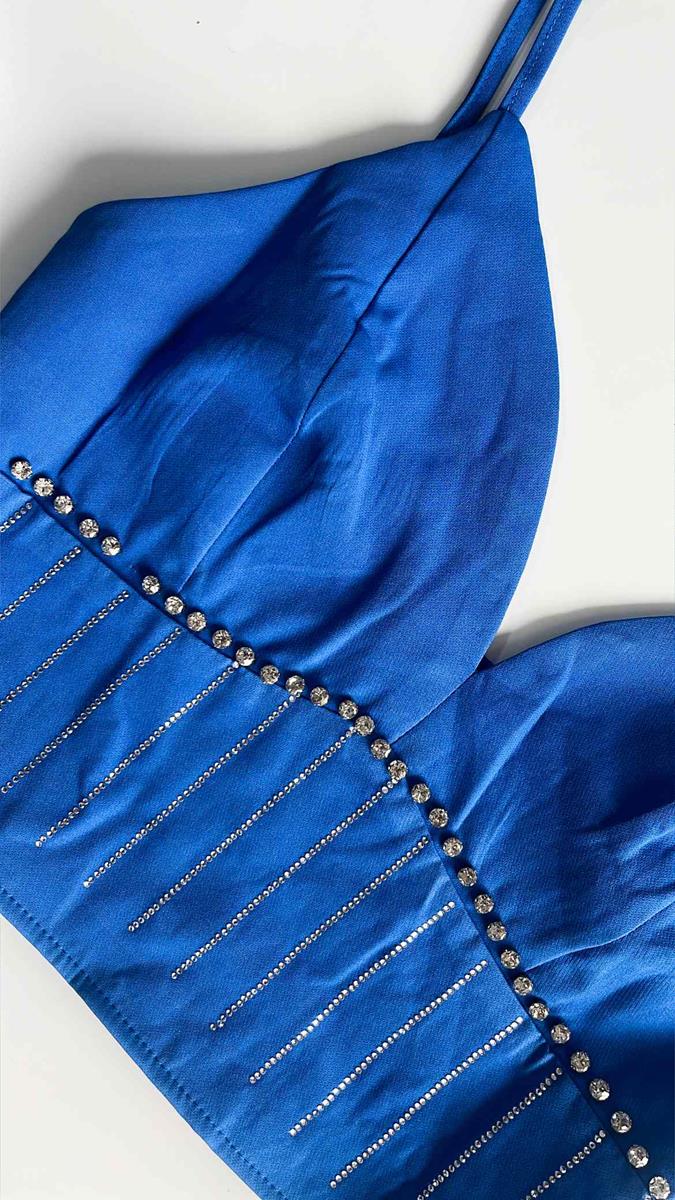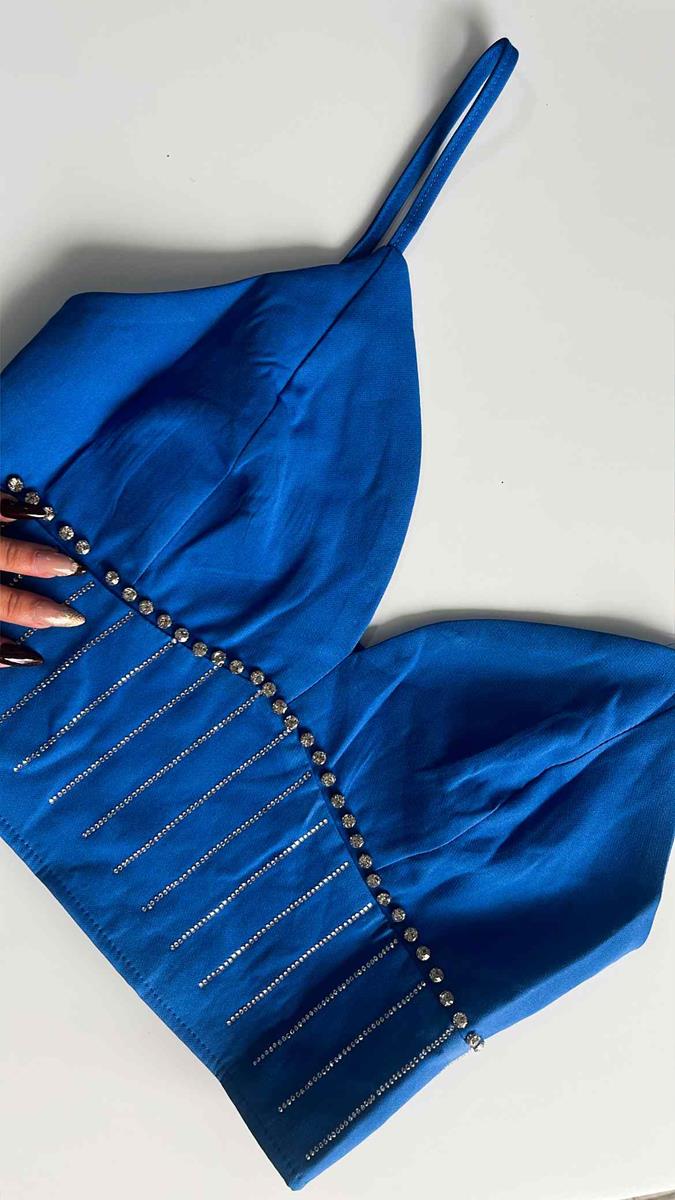 Cropped em tecido alfaiataria leve, com alças finas reguláveis e duplo na parte dos seios. Possui detalhe frontal em aplicação de pedrarias que traz um toque sofisticado à peça, além de lastex nas costas, garantindo melhor ajuste e conforto ao vestir.