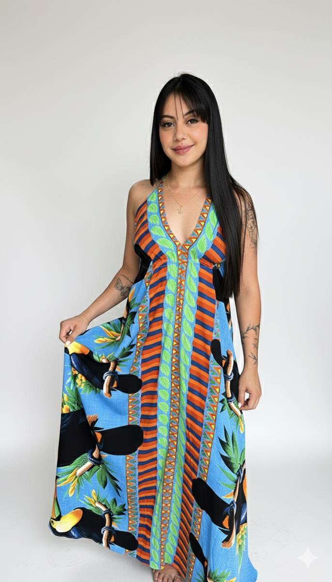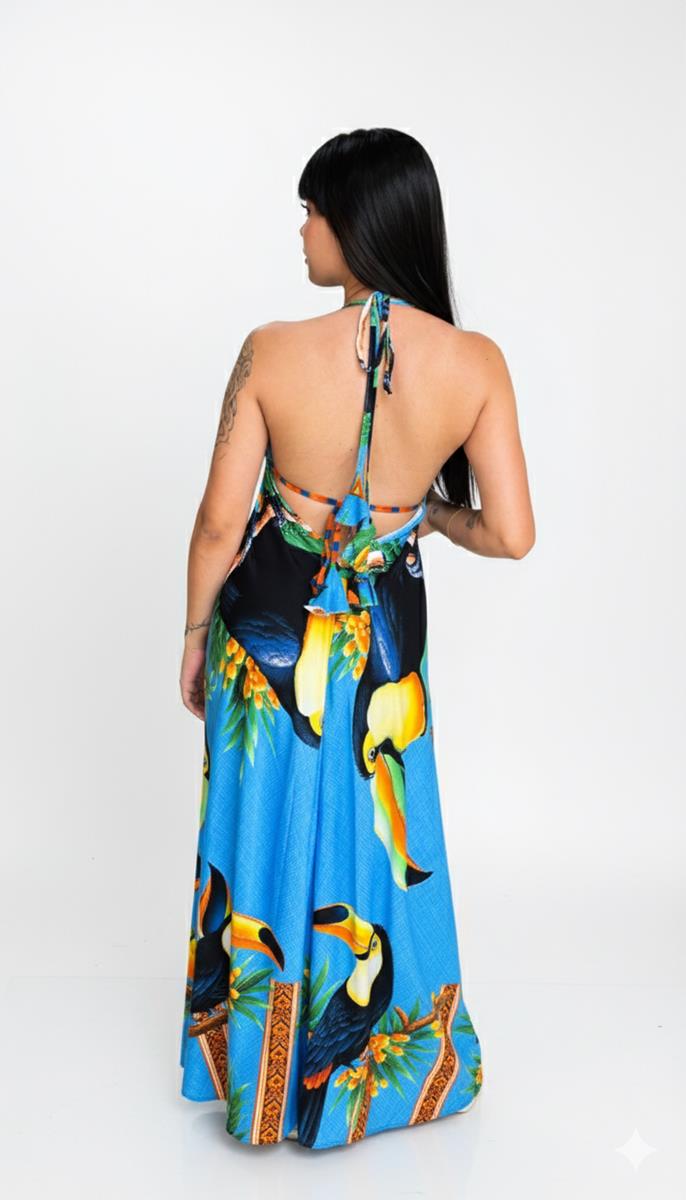 Sinta a energia do verão com nosso Vestido Longo Tropical. Com uma estampa exclusiva de tucanos e folhagens, esta peça é a definição de frescor e elegância. O modelo possui decote em "V" profundo que valoriza o colo e costas abertas com amarração ajustável, garantindo um caimento perfeito e fluido.