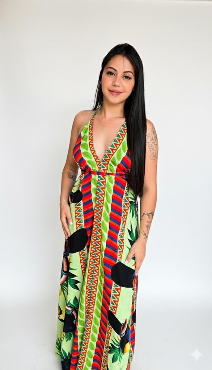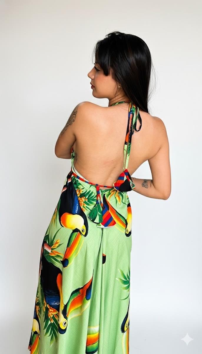 Sinta a energia do verão com nosso Vestido Longo Tropical. Com uma estampa exclusiva de tucanos e folhagens, esta peça é a definição de frescor e elegância. O modelo possui decote em "V" profundo que valoriza o colo e costas abertas com amarração ajustável, garantindo um caimento perfeito e fluido.