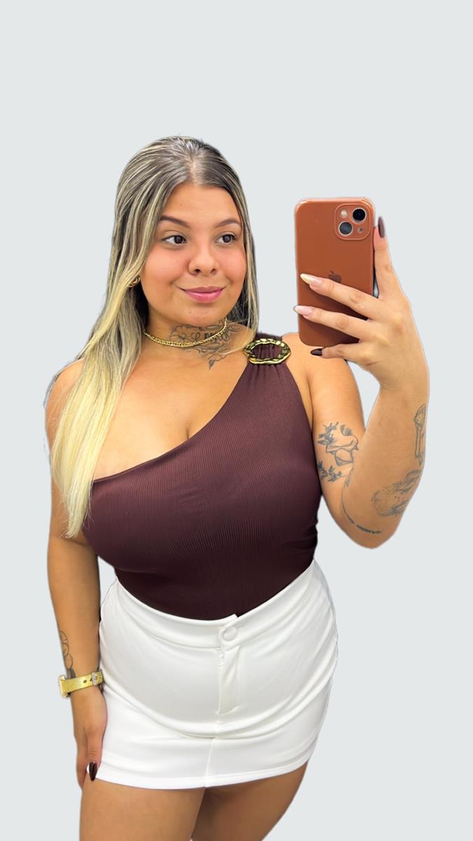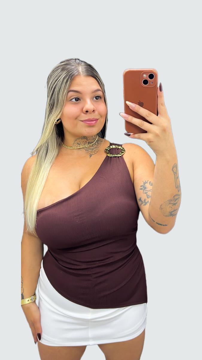 Esta blusa de um ombro só traz a tendência da assimetria aliada a uma argola metálica dourada trabalhada, que dispensa o uso de acessórios pesados. Confeccionada em tecido canelado de alta qualidade, possui bojo, ela se ajusta ao corpo com conforto, garantindo um look elegante e moderno para o dia ou para a noite.