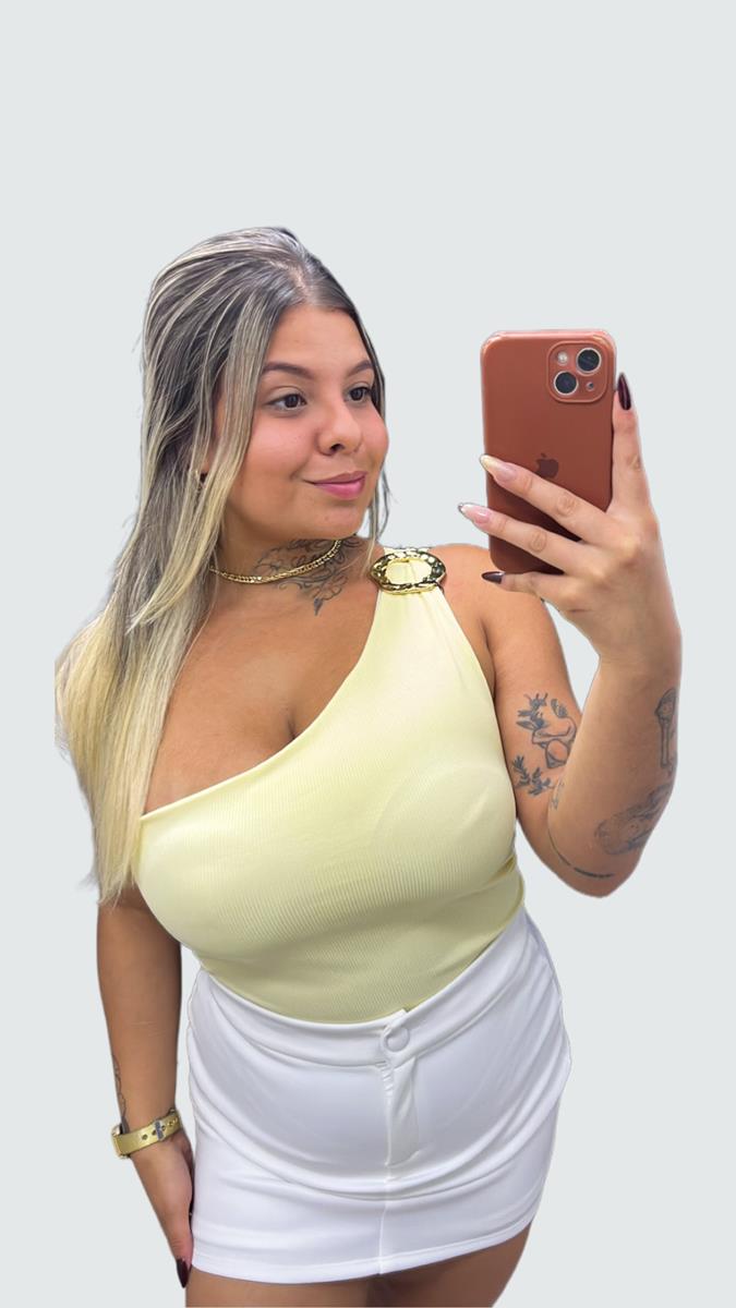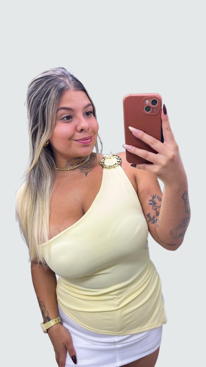 Esta blusa de um ombro só traz a tendência da assimetria aliada a uma argola metálica dourada trabalhada, que dispensa o uso de acessórios pesados. Confeccionada em tecido canelado de alta qualidade, possui bojo, ela se ajusta ao corpo com conforto, garantindo um look elegante e moderno para o dia ou para a noite.