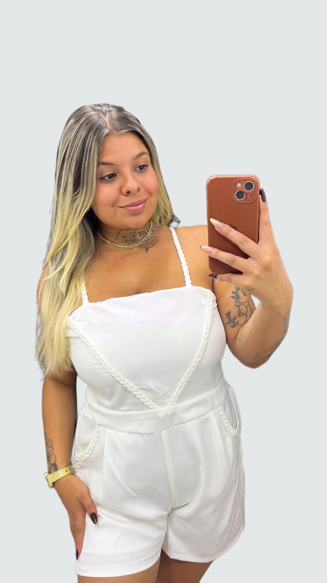 O macaquinho perfeito para quem não abre mão de estilo e praticidade. Esta peça se destaca pelos detalhes de tranças artesanais nas alças, no busto e nos bolsos, trazendo um charme único. O fechamento em lastex nas costas garante o ajuste perfeito ao corpo, unindo conforto e uma silhueta valorizada.