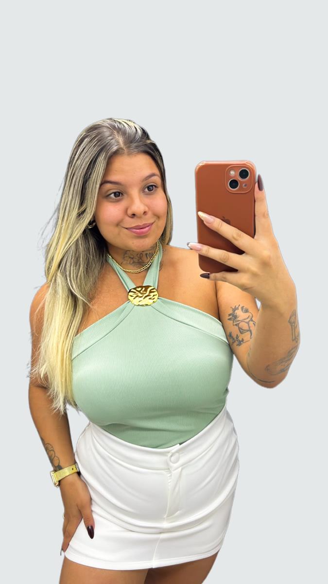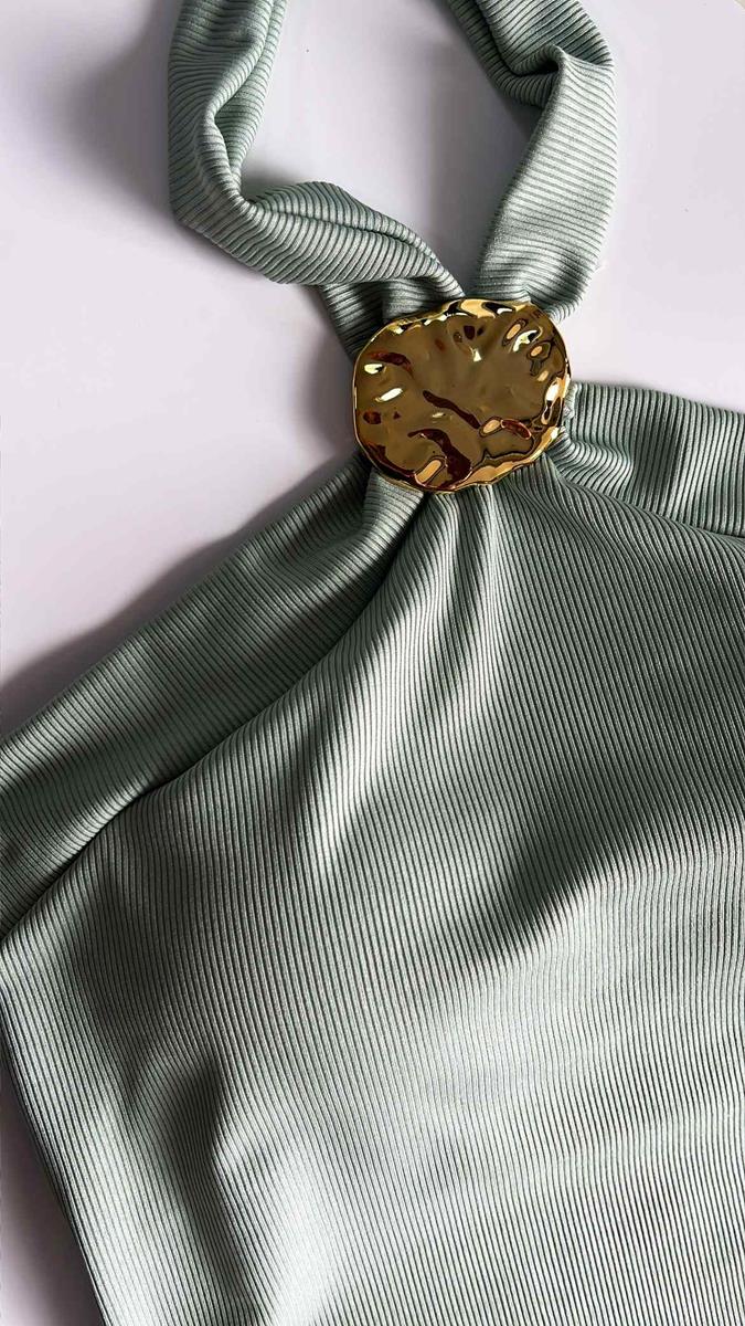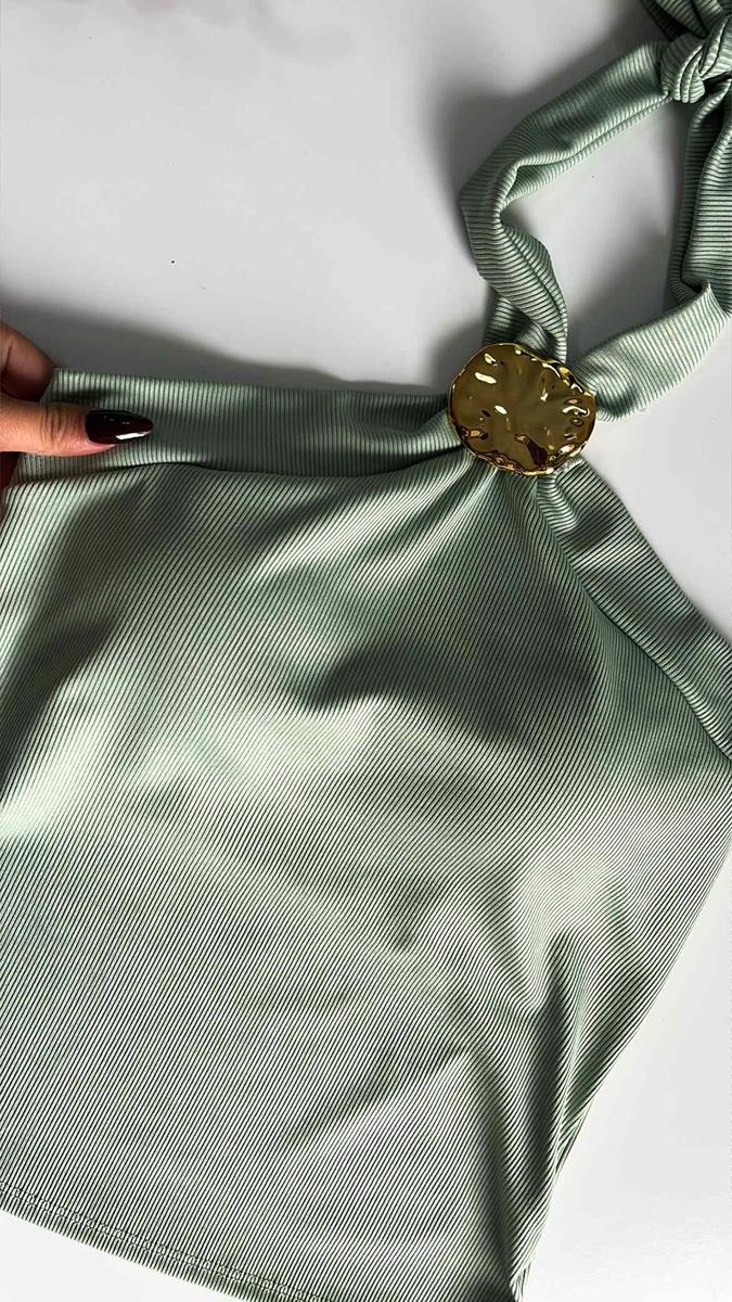 O equilíbrio perfeito entre o frescor do verão e o luxo dos detalhes. Essa blusa em malha canelada apresenta um acessório central dourado com design orgânico, que ilumina o colo e dispensa colares pesados. A modelagem possui bojo, frente única com amarração no pescoço permite um ajuste personalizado, valorizando a postura e os ombros com muita elegância.