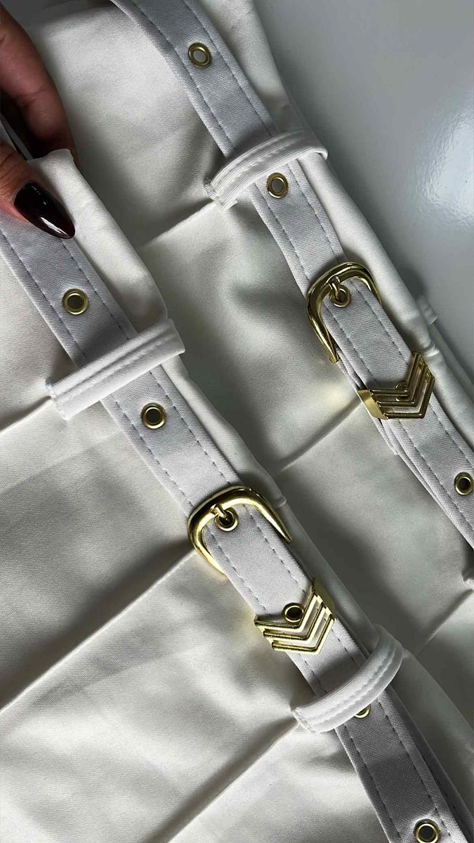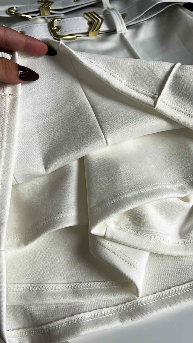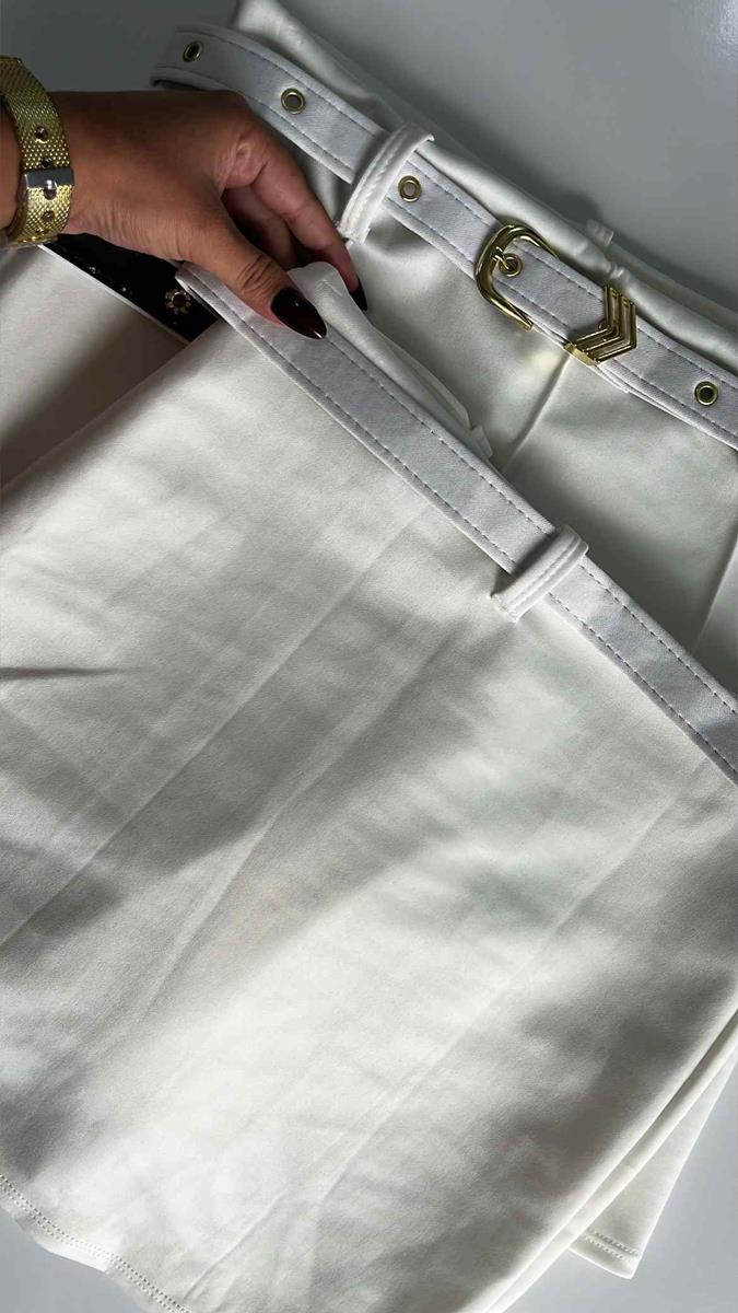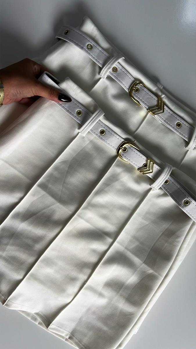 Esse short saia possui corte reto, pences frontais que garantem um ajuste impecável e acompanha um cinto com fivela dourada, adicionando um toque de luxo ao visual.