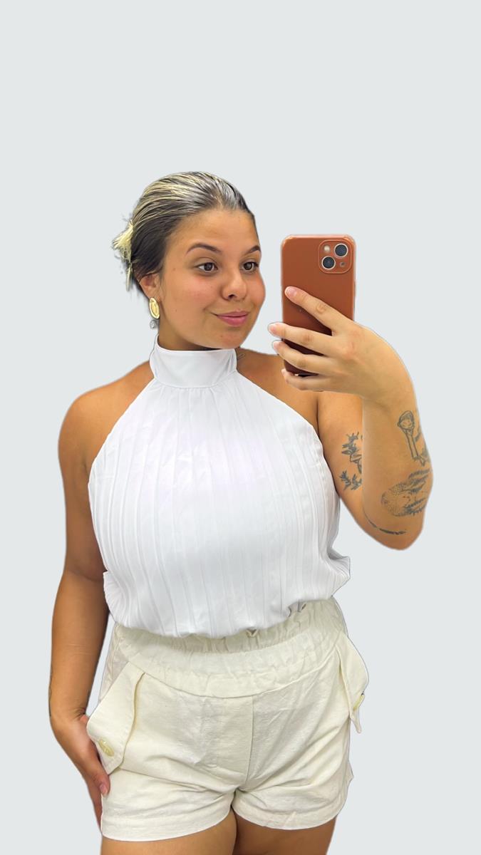 Blusa em tecido leve com textura plissada, modelagem soltinha e decote halter com gola alta. Possui costas abertas com amarração, garantindo ajuste perfeito e um toque elegante. Ideal para compor looks frescos, modernos e sofisticados.