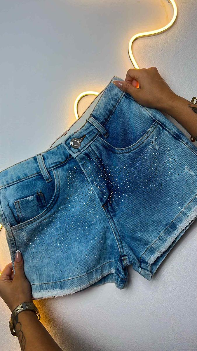 Estiloso e moderno, este short jeans é a escolha perfeita para quem quer unir conforto e brilho em um só look. Confeccionado em jeans de alta qualidade, ele possui lavagem moderna e aplicações delicadas de strass na parte frontal, que trazem um toque sofisticado e cheio de charme.